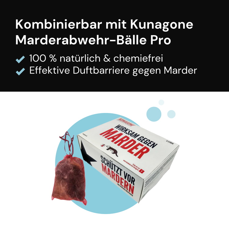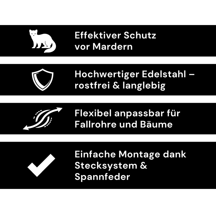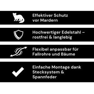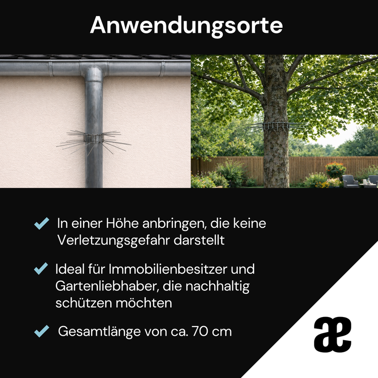 Grâce à la construction robuste en acier inoxydable, la ceinture est résistante aux intempéries et adaptée à une utilisation extérieure permanente. Avec une longueur totale d’environ 70 cm, elle peut être ajustée de manière flexible et convient pour jusqu’à deux gouttières DN 100. Les pointes d’environ 150 mm agissent comme une barrière efficace et empêchent la montée sur les gouttières et les arbres, ce qui empêche généralement l’entrée dans les bâtiments.