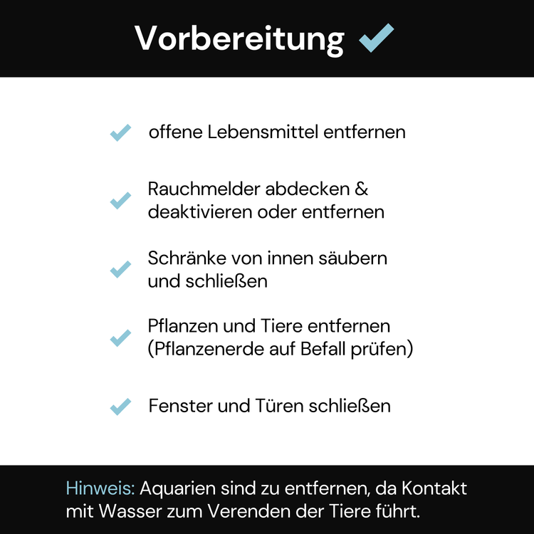 4. Trattamento successivo: arieggiare la stanza per almeno 60 minuti, pulire le superfici – poi utilizzabile normalmente.