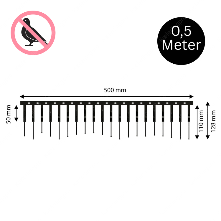 Die Spikes verfügen über eine Stabstärke von 2,0 mm, eine selbstjustierende Spitzenlänge von 110 mm (inklusive Leiste 128 mm) oder 170 mm (inklusive Leiste 188 mm) und einen regelmäßigen Spitzenabstand von 25 mm, bei einer Länge von 500 mm je Element und hochwertiger Verarbeitung aus 1.4301 rostfreiem Edelstahl.